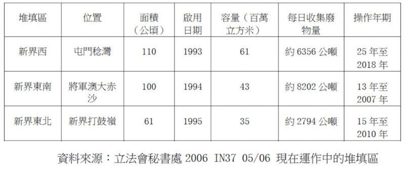 香港共有16個堆填區,當中13個已經關閉,而其餘3個仍在運作,為公眾提供廢物處置服務。現時香港所有固體廢物都會被送去三個堆填區(新界東、新界東北和新界西),現時只有新界西的堆填區接受家居廢物,故此亦能說它是全香港壓力最大的堆填區。根據2006年立法會文件,現時運作三個堆填區本來早已超出運作年期,但因為近期的擴建後,現時都還在使用中,可見廿多年來的廢物政策是多麼的短視。